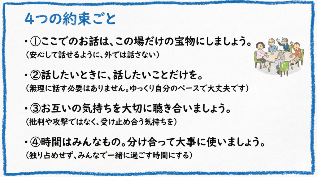 「語り合いの場」とは、安心して、何を話してもよい場。
